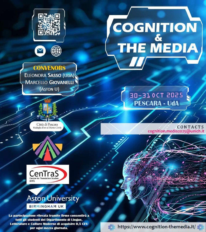 In data 30-31 ottobre 2025 presso il Museo delle Genti d'Abruzzo si terrà il Convegno internazionale "Cognition and the Media" organizzato dalla Prof.ssa Eleonora Sasso, Professore Associato di Lingua, traduzione e linguistica inglese del Dipartimento di Lingue, Letterature e Culture Moderne di Pescara (Università degli Studi “G. D’Annunzio”) insieme al Prof. Marcello Giovanelli dell'Università di Aston (Birmingham, UK), Direttore dell’Aston Stylistics Research Group. Il convegno gode del patrocinio dell’AIA (Associazione Italiana di Anglistica), del CENTRAS (the Centre for Translation Studies at UCL, UK), della Aston University e della città di Pescara.