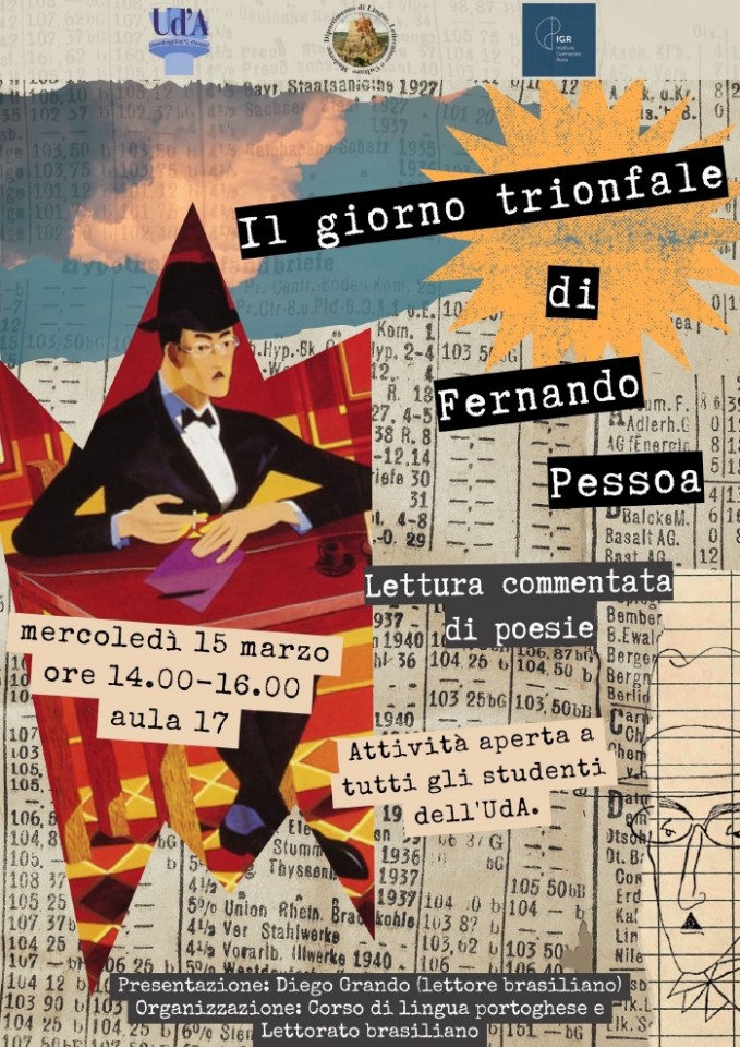 Il Corso di Lingua Portoghese e Brasiliana del Dipartimento di Lingue, Letterature e Culture Moderne invita la comunità accademica all'attività culturale "Il giorno trionfale di Fernando Pessoa", in commemorazione della 'data di nascita' degli eteronimi del poeta portoghese Fernando Pessoa, l'8 marzo 1914.