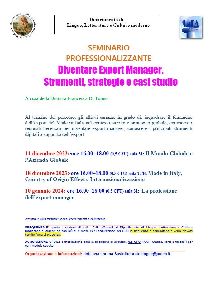 Seminario professionalizzante - "Diventare Export Manager. Strumenti, strategie e casi studio" - 14, 18 dicembre 2023 e 10 gennaio 2024.(aggiornamento)