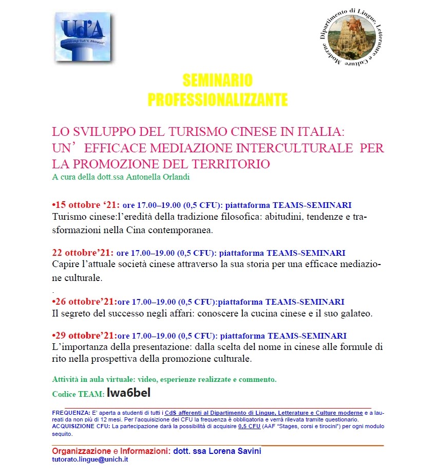 Seminario Professionalizzante. - Online - "LO SVILUPPO DEL TURISMO CINESE IN ITALIA: UN’EFFICACE MEDIAZIONE INTERCULTURALE PER LA PROMOZIONE DEL TERRITORIO". 15, 22, 26, 29 ottobre 2021