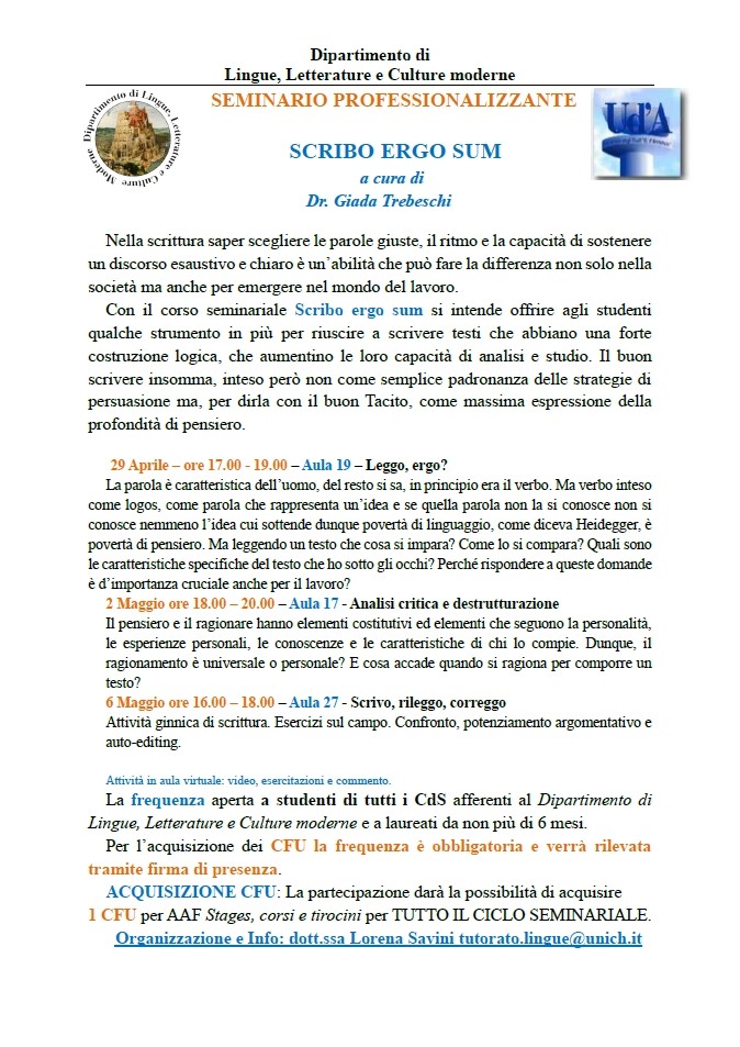 Seminario professionalizzante - SCRIBO ERGO SUM - 29 aprile 2 e 6 maggio 2024.
