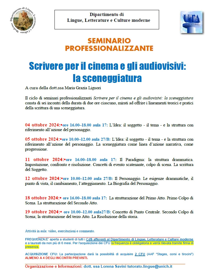 Seminario professionalizzante - "Scrivere per il cinema e gli audiovisivi: la sceneggiatura" - 4, 5, 11, 12, 18 e 19 ottobre 2024