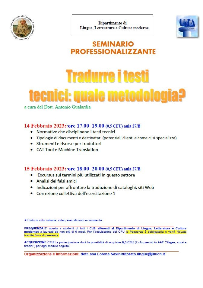 Seminario Professionalizzante - Tradurre i testi tecnici: quale metodologia ? - 14 e 15 febbraio 2023