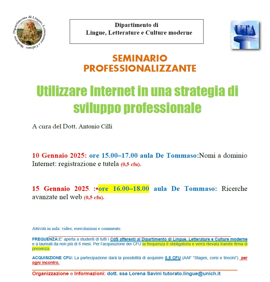 Seminario professionalizzante - Utilizzare Internet in una strategia di sviluppo professionale - 10 e 15 gennaio 2025